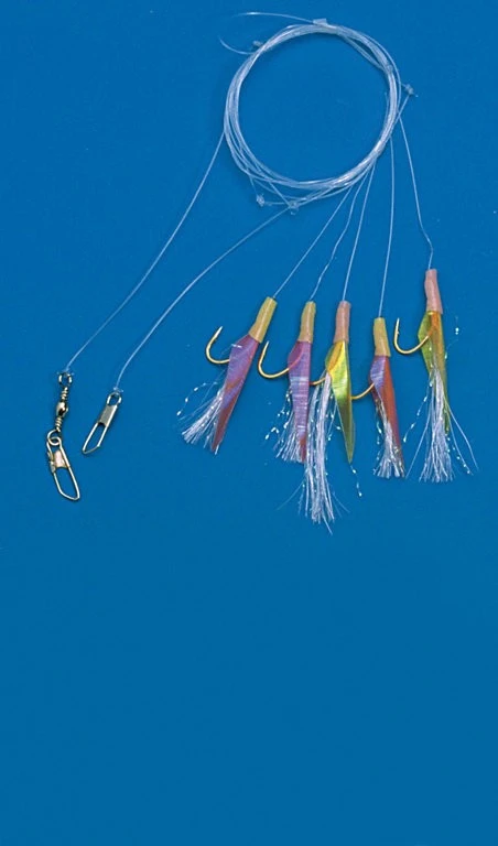Dieses Herings-System basiert auf fünf goldenen Haken der Größe 1, welche mit regenbogenfarbenen Glitzerfliegen verziert sind. Die Länge beträgt 1,40m und der Schnurdurchmesser 0,40mm.