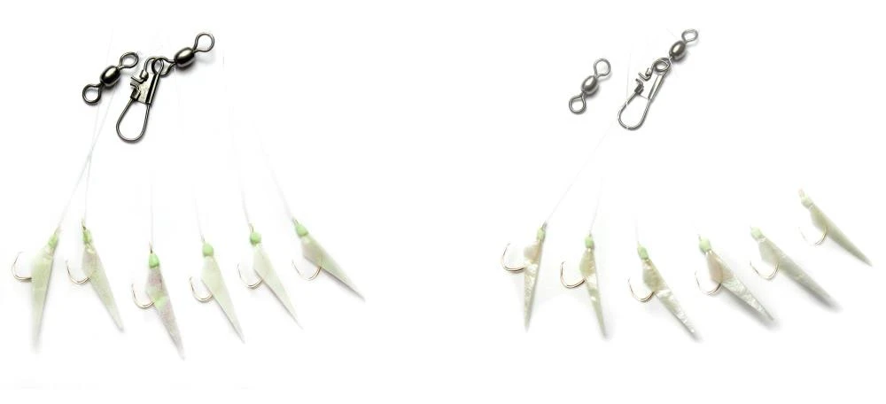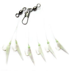 Diese Heringsvorfächer haben Circle Hooks. Die Hakengröße ist 6. Diese sind an einer 6cm langen Mundschnur der Stärke 0,25mm befestigt. Die Hauptschnur mit einer Länge von 1,45m hat eine Stärke von 0,30mm (Natural) bzw. 0,35mm (Glow).