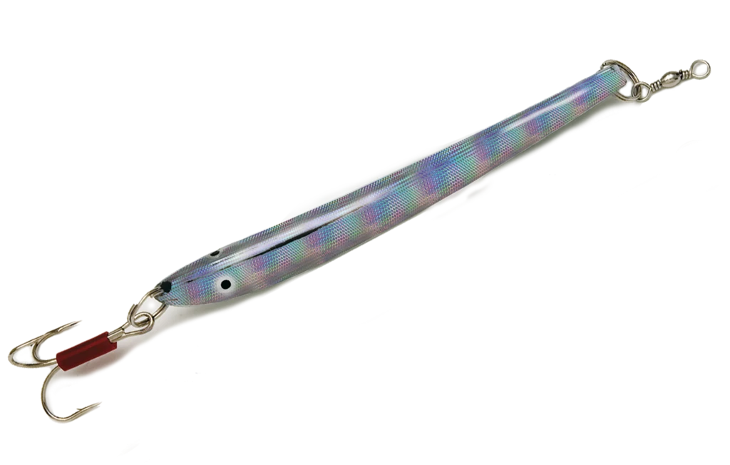 Dieser Bananen-Pilker ist mit einer holografischen Folie überzogen, die beim Absinken in die Tiefe durch den Lichteinfall und Drehung für unwiderstehliche Lockreize sorgt. DEr Pilker ist in Gewichten von 100g bis 400g verfügbar. Es gibt die Ausführungen mit oder ohne Makk-Beihänger.