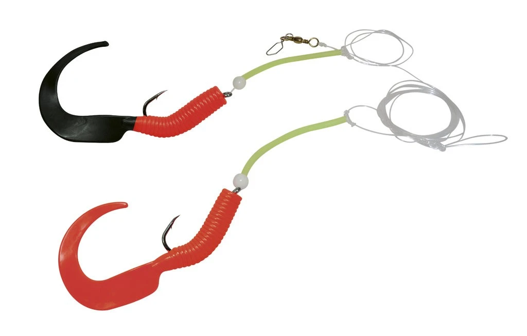 Diese Rig wurde von Eisele speziell auf die Zielfische im Atlantik entwickelt. Es besteht aus hochertigen Komponenten wie 2 riesigen Twistern in der Farbe Rot und Rot-Schwarz. Diese sind auf Haken der Größe 9/0 aufgezogen, welche wiederum an einer starken 1,2mm monofilen Schnur befestigt sind. Als Abstandshalter dienen 10cm lange Gummischläuche. An deren Ende sitzt eine Fluo-Perle. Das ganz Vorfach ist Made in Germany.