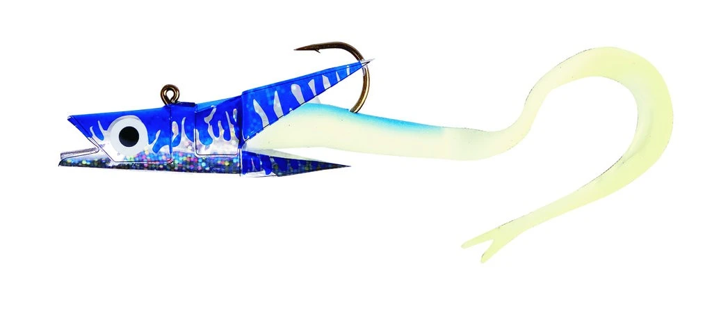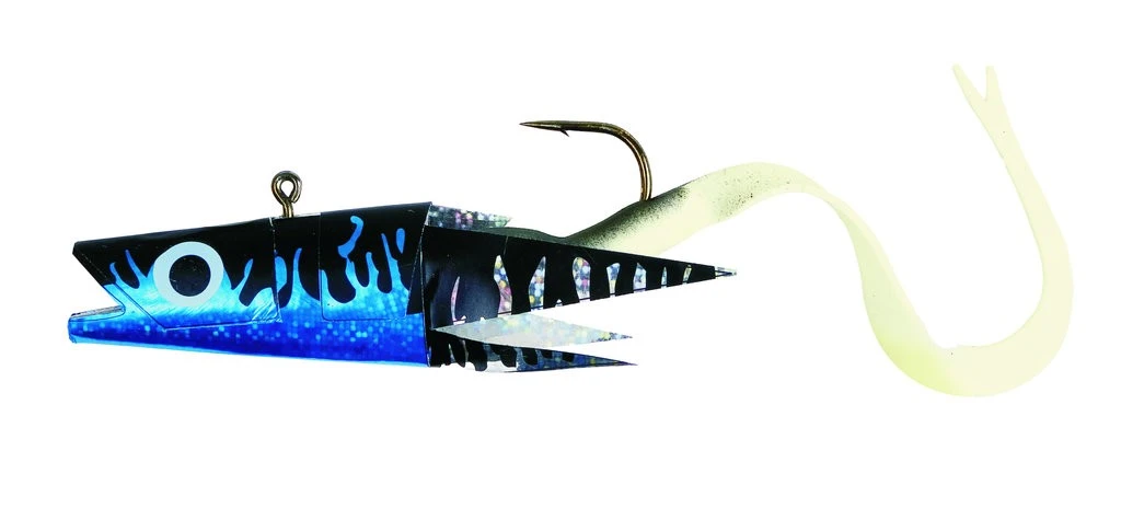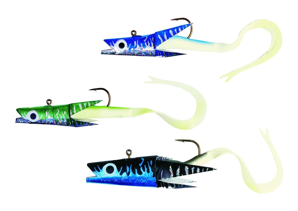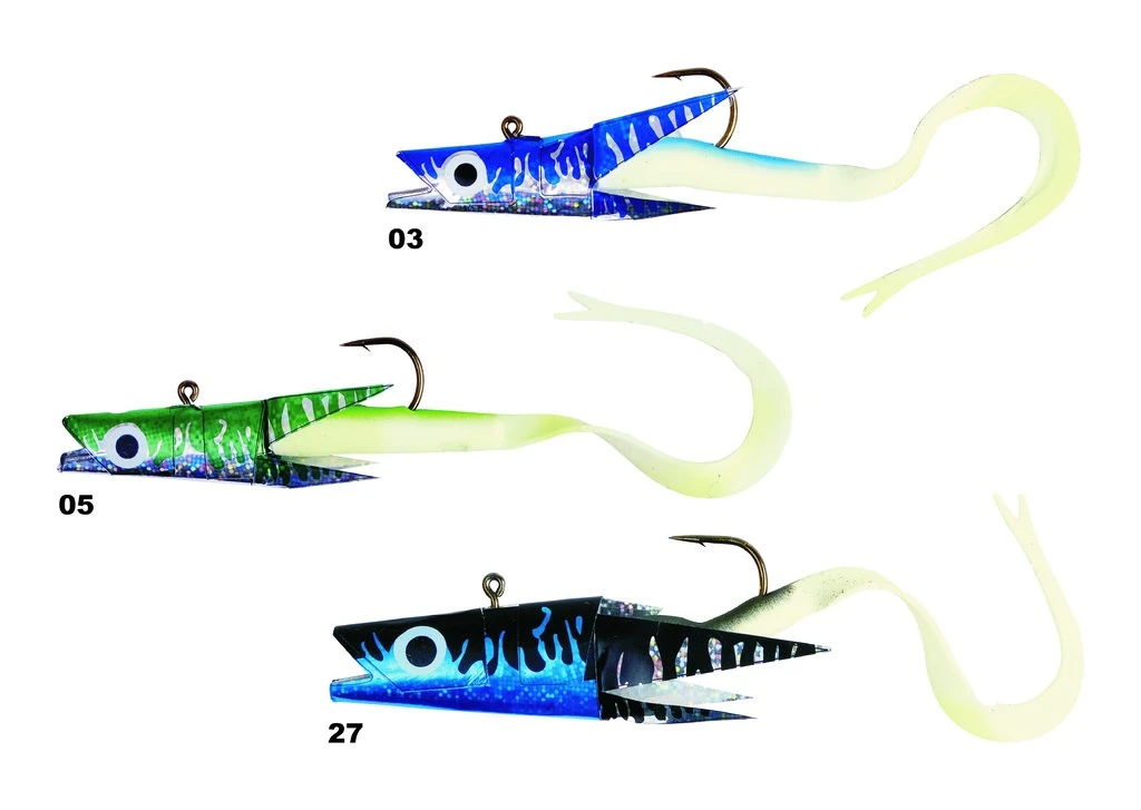 Dieser Gummiköder wurde speziell für Pollack, Dorsch und Seebarsch entwickelt, aber auch Seelachs und andere Räuber sind diesem Köder nicht abgeneigt. Der glänzende Körper und der leuchtende Schwanz mach diesen Köder unwiderstehlich. Die großen Augen tun ihr übriges dazu. Dieser Köder ist in 3 Farben und Gewichten verfügbar. Die Modelle mit 30g und 50g beistzen eine Hken der Größe 5/0. Das Modell 90g hat einen Haken der Größe 9/0.