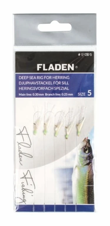 Dieses Heringssystem besteht aus 5 goldenen Haken der Größe 5, die mit Fischhautimitat verziert sind. Der Kopf besitzt eine Fluo-Färbung. Die Hauptschnur hat eine Stärke von 0,30mm und die Seitenarme von 0,25mm.