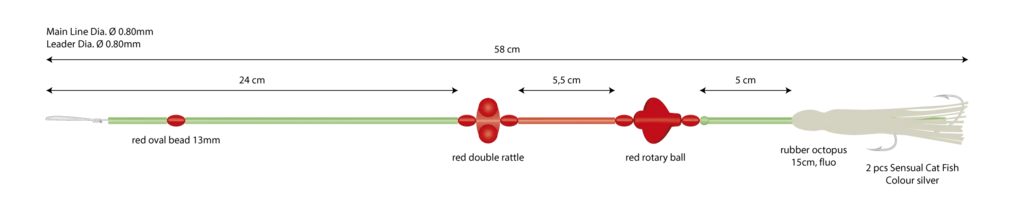 Das Rig besitzt zwei Haken zum Angeln mit Fischfilets und kleinen Köderfischen. Es hat eine sich drehende Rassel und Turbin, sowie einen sehr natürlichen, transparenten Oktopus. Zuätzlich sorgt ein Leuchtschlauch für Schutz der Schnur und zur Erhöhung der Reizwirkung. Geeignet ist das Vorfach für Dorsch, Seelachs und Leng in Tiefen von 50 bis 300m. Aufgrund der Hakenanordnung können auchkomplette Köderfische angeködert werden. Der Oktopus spielt sehr verführerisch in der Strömung und ist von einem echten Oktopus kaum zu unterscheiden. Dieses Vorfach ist ideal bei mittlerer und starker Strömung. Es wird am Durchlauf-Sea-Boom geangelt und bei schwacher Strömung am Metall Boom. Bei diesem Vorfach muss ein Anschlag gesetzt werden. Die Länge des Vorfaches ist 58cm bei einem Schnurdurchmesser von 0,80mm.