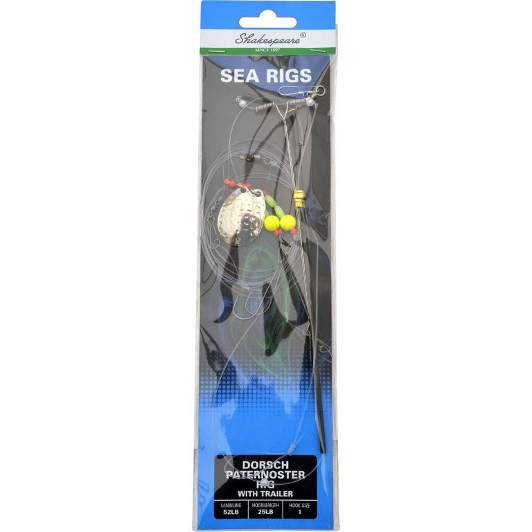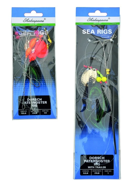 Dieses Dorschvorfach gibt es in 2 Ausführungen. Beide Typen besitzen zwei Haken, Lockperlen und Spinnerblätter. Sie unterscheiden sich dadurch, das eine Typ einen Trailer und eine Abstandshalter besitzt, während die andere Ausführung keine Trailer hat, dafür aber zwei Abstandshalter. Die Ausführung mit Trailer hat zwei Haken der Größe 1 und die ohne Trailer zwei Haken der Größe 1/0. Beide Rigs haben eine Hauptschnur mit einer Tragkraft von 52lb (24kg) wobei die Vorfachschnur der Seitenarme eine Tragkraft von 25lb (11kg) aufweist.
