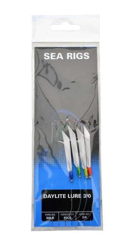 Dieses Meeresvorfach gibt es in zwei Varianten mit Hakengröße 1/0 und 3/0. Die Haken sind mit Fischhautimitaten verziert. Das Vorfach ist ideal für Makrele und Seelachs, aber auch in der Variante 1/0 für große Heringe.