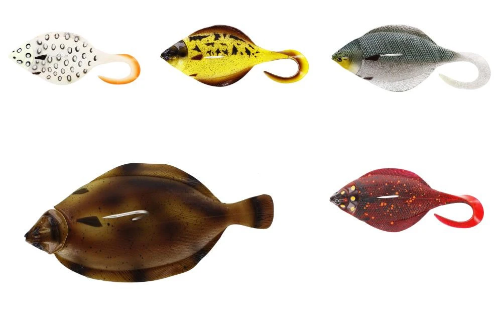 Diese Gummifisch in Form eines kleinen Plattfisches ist der ideale Köder für Heilbutt und Großdorsch. Es gibt diesen Köder in verschiedenen Farben. Die Gummifische haben eine Länge von 24,5cm und ein Gewicht von 400g.
