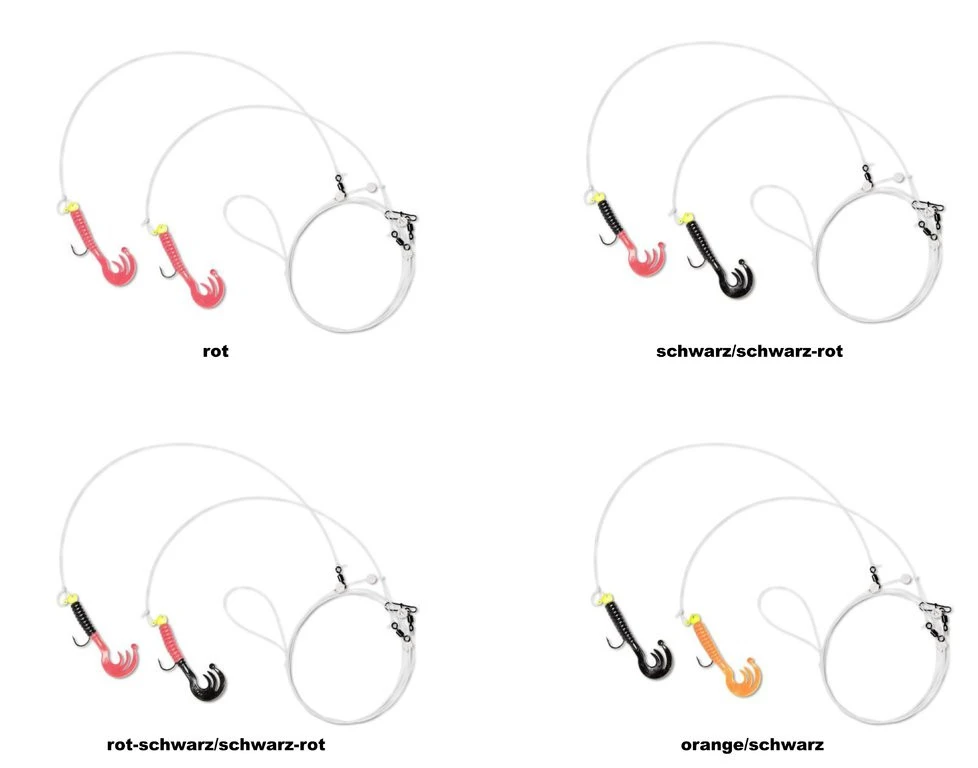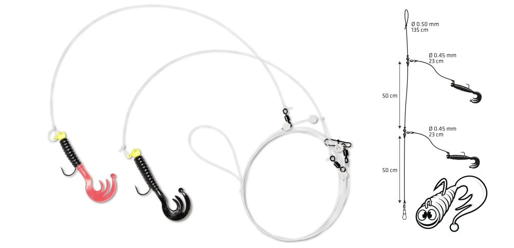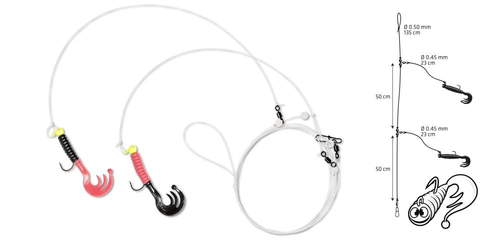 Dieses spezielle Vorfach ist für den Fang von Dorsch konzipert worden. Es gibt zwei verschiedene Ausführungen. Der Unterschied zwischen beiden Varianten besteht im Abstand der Seitenarme zueinander und dem Abstand zum Grundwirbel. Die erste Variante ist 50/50 geteilt, dass bedeutet der Abstand zwischen den beiden Seitenarmen und dem Grundwirbel beträgt 50cm. Bei der zweiten Variante 40/60 ist der Abstand zwischen den Seitenarmen 60cm und der Abstand zum Grundwirbel 40cm. Beide Vorfachvarianten besitzen eine 0,50mm starke Hauptschnur und die Seitenarme eine Stärke von 0,45mm. Die Tragkraft der Vorfächer ist mit 17kg angegeben. Es gibt vier verschiedene Farben, in denen die Twisterschwänze eingefärbt wurden. Die Twister mit Curly Tail haben eine Länge von 7,5cm und sind an einem 3,5g Trophy LOOky Jig-Kopf der Hakengröße 3/0 befestigt. Die Vorfächer haben eine Länge von 135cm und die Seitenarme sind 23cm lang.
