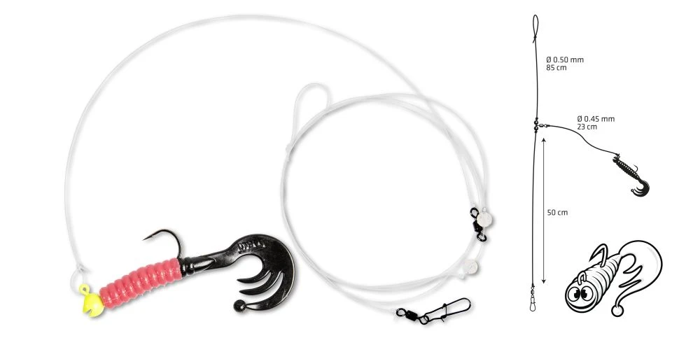 Dies ist ein Pilkvorfach mit Einzeltwister. Der Twister hat eine Länge von 7,5cm und ist an einem 3,5g schweren LOOky Jig Head befstigt. Es gibt vier verschiedene Farben. Die Schnurstärke ist 0,50mm und wird mit einer Tragkraft von 17kg angegeben. Der Abstand zwischen Bodenwirbel und dem 23cm langen Seitenarm beträgt 50cm. Der verwendete Jigkopf besitzt einen Haken der Größe 3/0.
