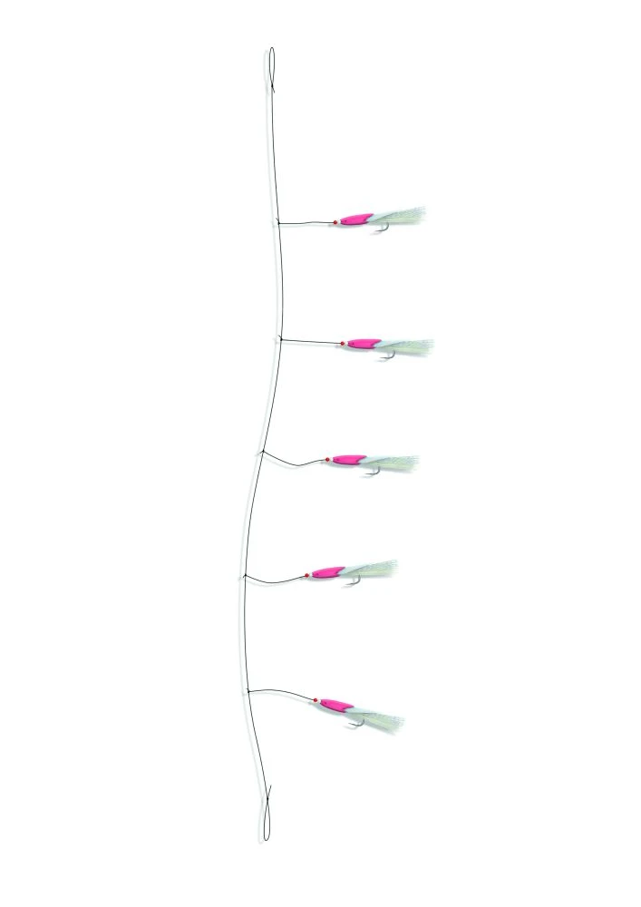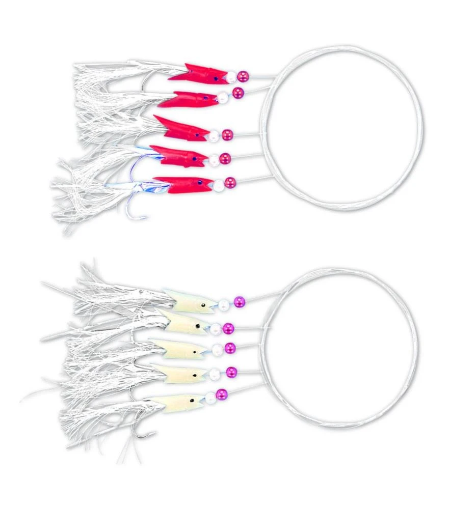 Dieses Vorfach besitzt 5 rote oder 5 phosphoreszierenden Fischchen und farbigen Perlen. Gebunden sind die an Haken der Größe 2/0 an einer Schnur m,it einem Durchmesser von 0,50mm. Verfügbar ist das Vorfach in zwei verschiedenen Farben.